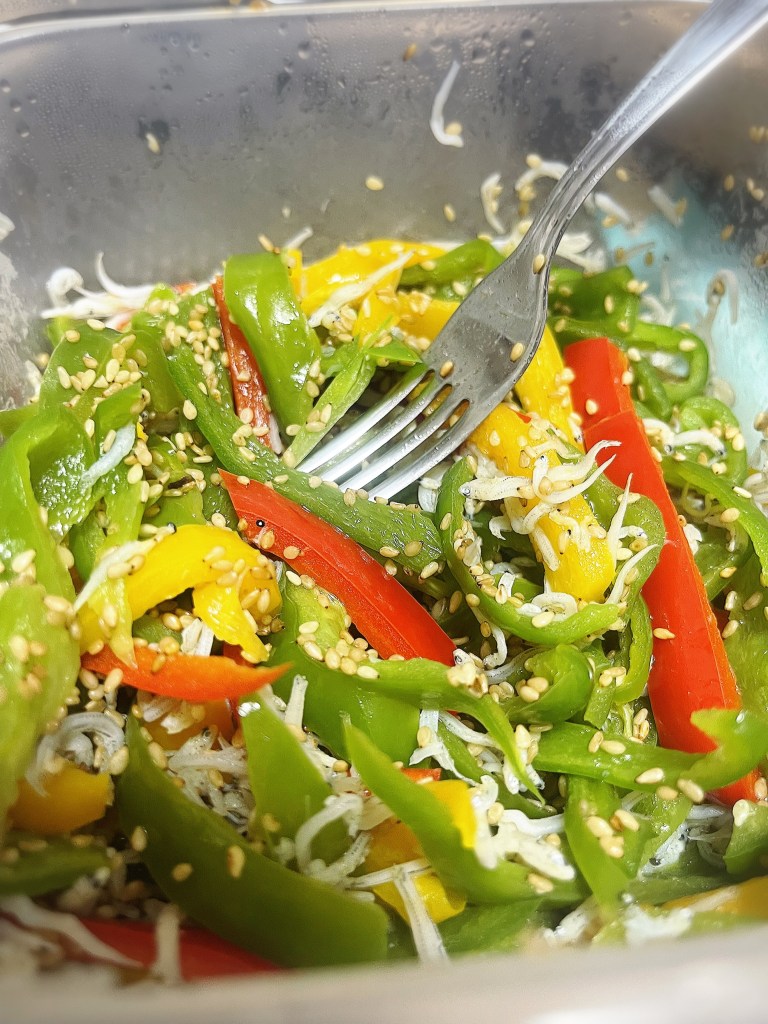 ♡ピーマンとごま m + 2年前 パプリカとピーマン五個ぐらい じゃこ1パック、塩と胡麻油かけて、チン。 我ながら時短で美味しいメニューできた☺️ 無限ピーマン🫑体に良さそう✨ ♡トースト日付2024年6月22日関連理由日常♡こんばんは日付2024年6月22日関連理由日常